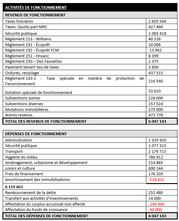 Le conseil adopte le budget de la Municipalité du Canton de Gore pour l’exercice financier de l’an 2026, prévoyant les revenus équivalant aux dépenses et se chiffrant comme suit :