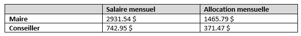 2018Maire 1 579.19$ 789.59$ Conseillers 400.22$ 200.11$ -