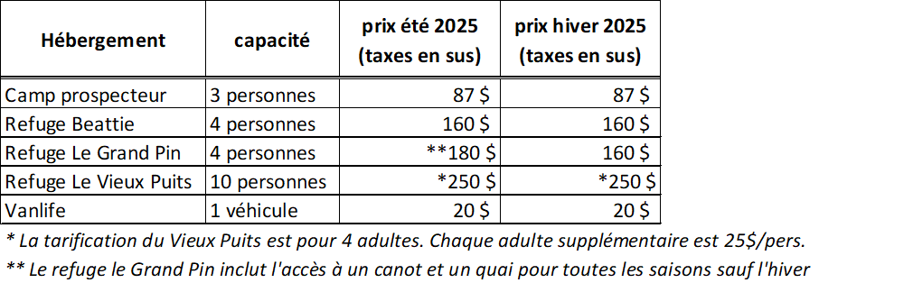- Été : Refuge le Beattie : 160$ ; Refuge Le Grand Pin : 180$ (inclus un canot)