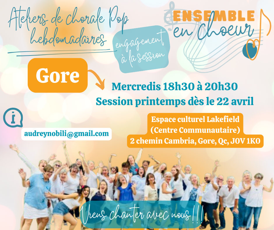 Ci-dessous, vous trouverez tous les cours, les ateliers et les activités qui auront lieu prochainement au centre communautaire (2, chemin Cambria, Gore).